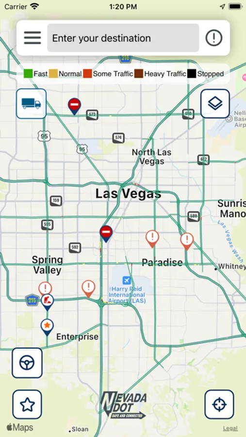 The Nevada 511 app provides near real-time highway and traffic information to drivers to help them safely plan their route. This includes information on construction, incidents, road closures, and weather alerts on roads across the state.