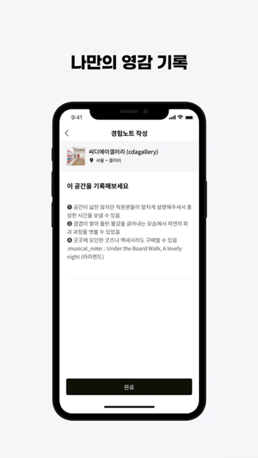 “방문” 완료한 공간에는 나만의 경험노트를 남길 수 있어요. 뇌리를 스친 순간의 인사이트나 나도 모르게 흥얼거린 BGM, 반짝 아이디어를 기록해봐요. 공개 프로필을 통해 당신만의 경험을 세상에 공유할 수 있습니다.