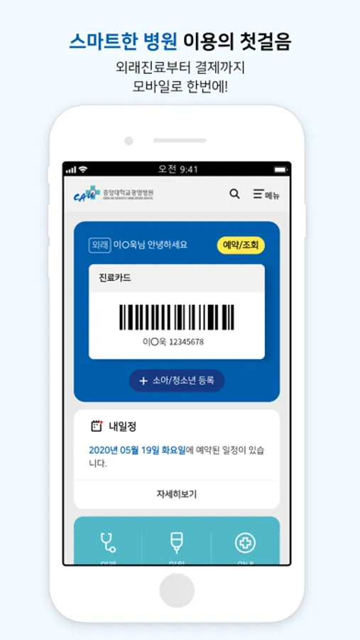 중앙대학교광명병원을 편리하게 이용할 수 있는 모바일 어플리케이션 입니다
