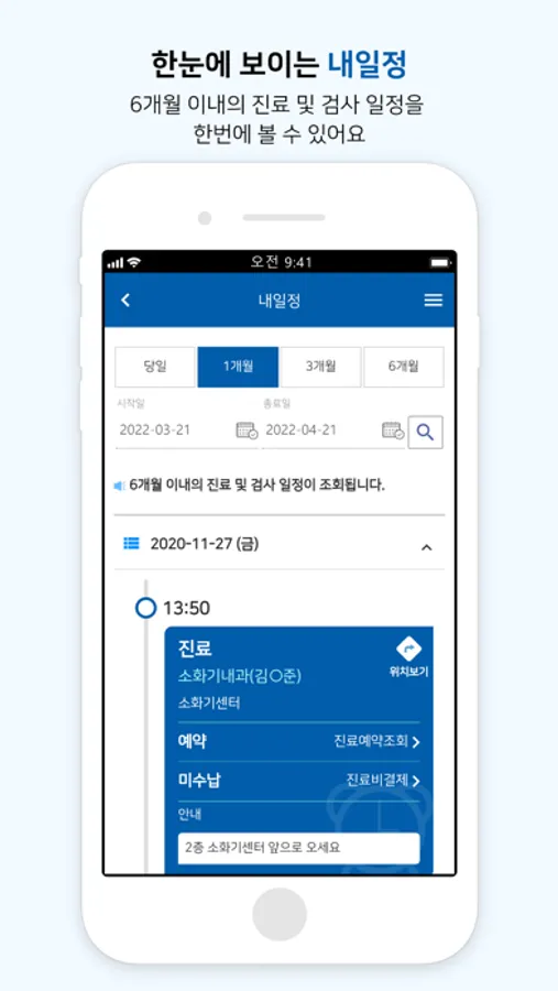 병원에서의 진료일정을 한번에 보실 수 있습니다.