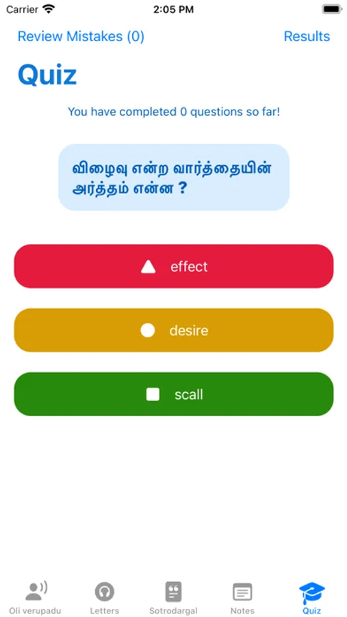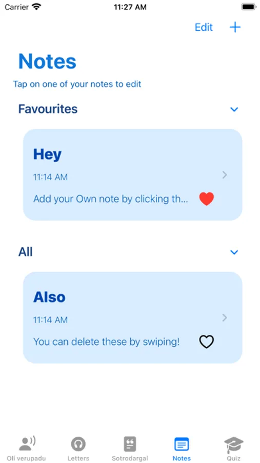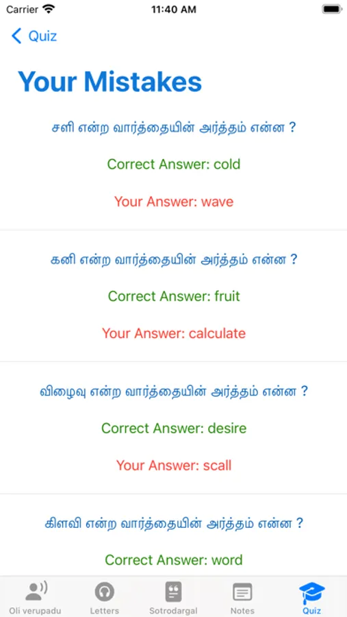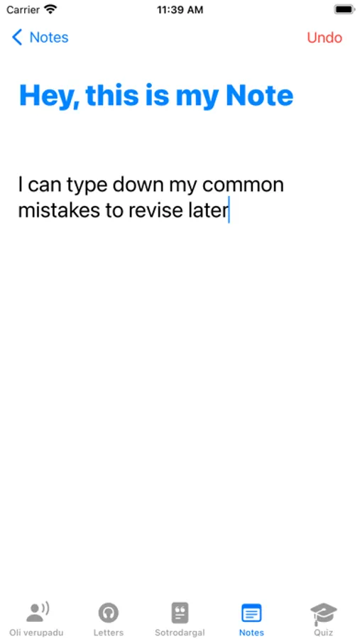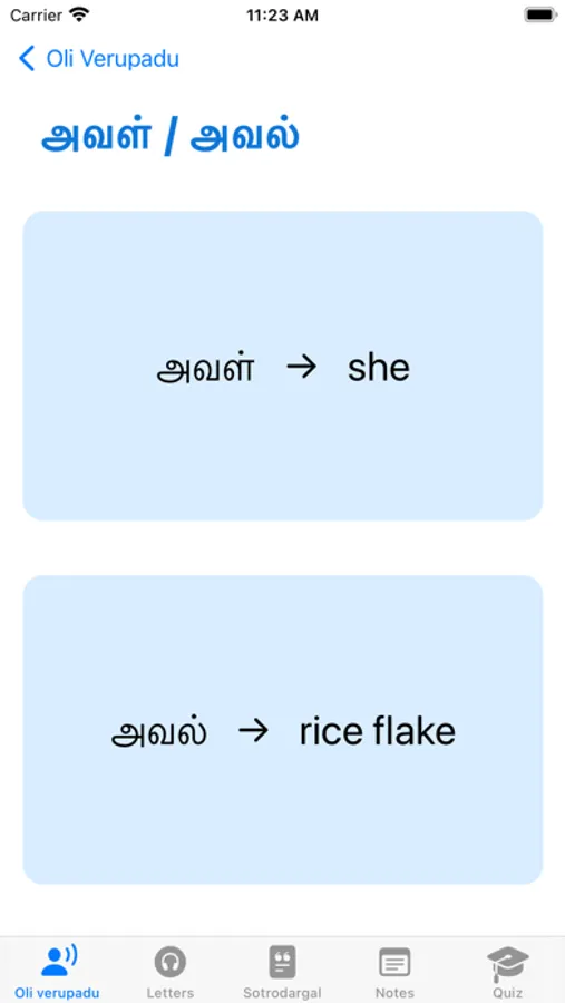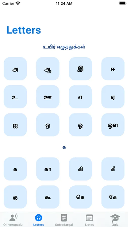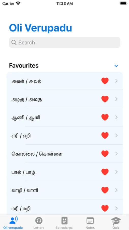 Tamiliva allows you to learn, favourite and search up Oli Verupadu, Learn Tamil letter pronunciation, Learn composition phrases, take notes and test your understanding in the quiz!