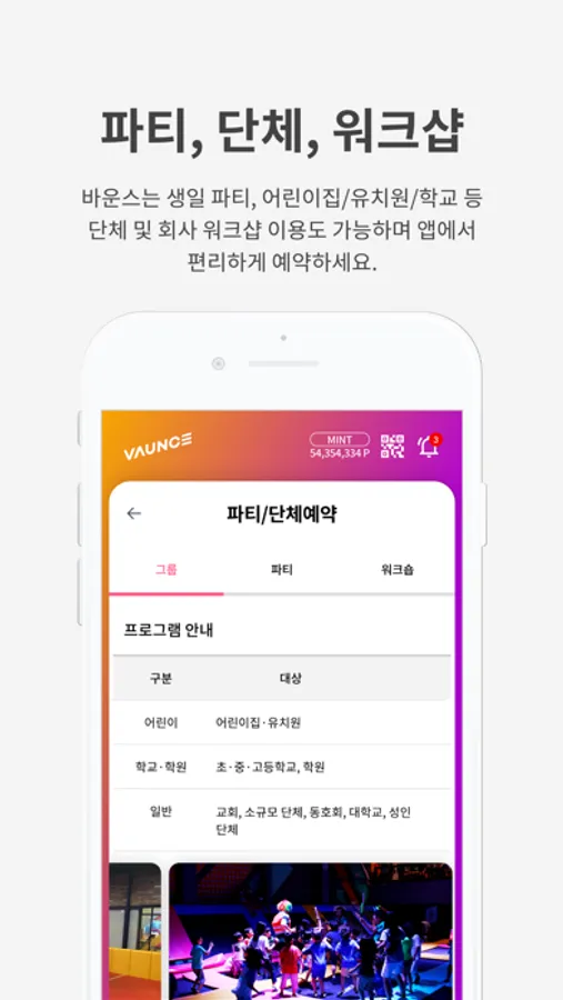 바운스는 생일 파티, 어린이집/유치원/학교 등 단체 및 회사 워크샵 이용도 가능하며 앱에서 편리하게 예약하세요.