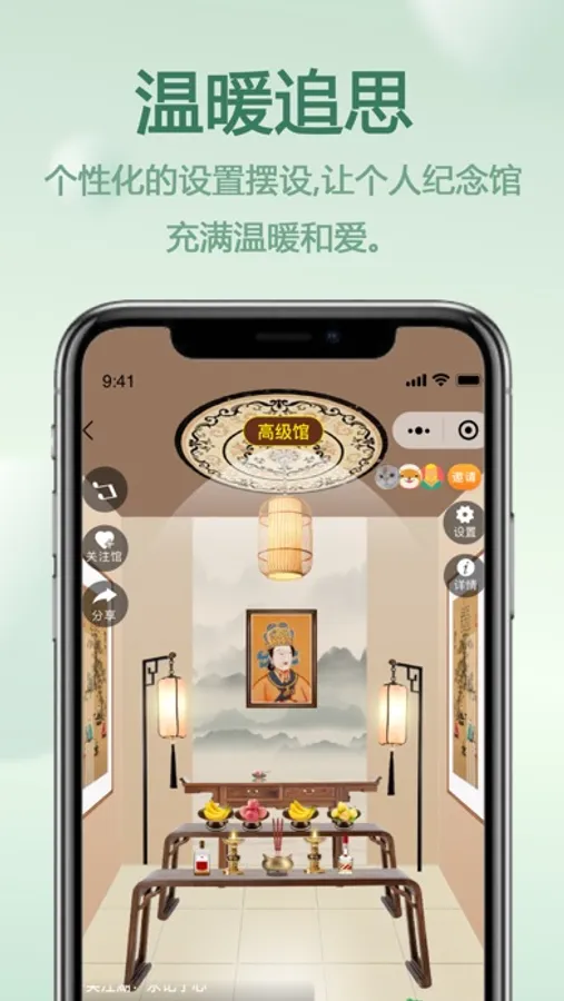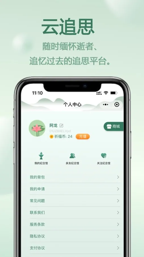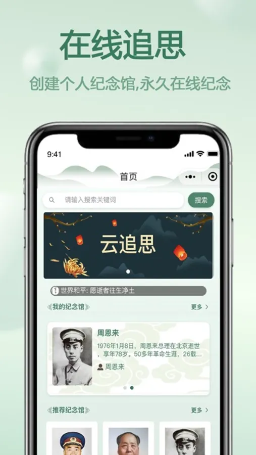云追思是一种通过移动终端APP进行网上追思的平台系统。通过云追思平台, 用户可为逝者创建网上个人纪念馆、书写逝者生平事迹、上传影像资料、发 表纪念文章、在线追思留言等,同时可以邀请好友,加入亲友团,一同书写, 共同追思,让个人纪念馆充满温暖和爱。云追思利用了网络不受时空限制的 优势,为人们搭建了一个可以随时缅怀逝者、追忆过去的追思平台。