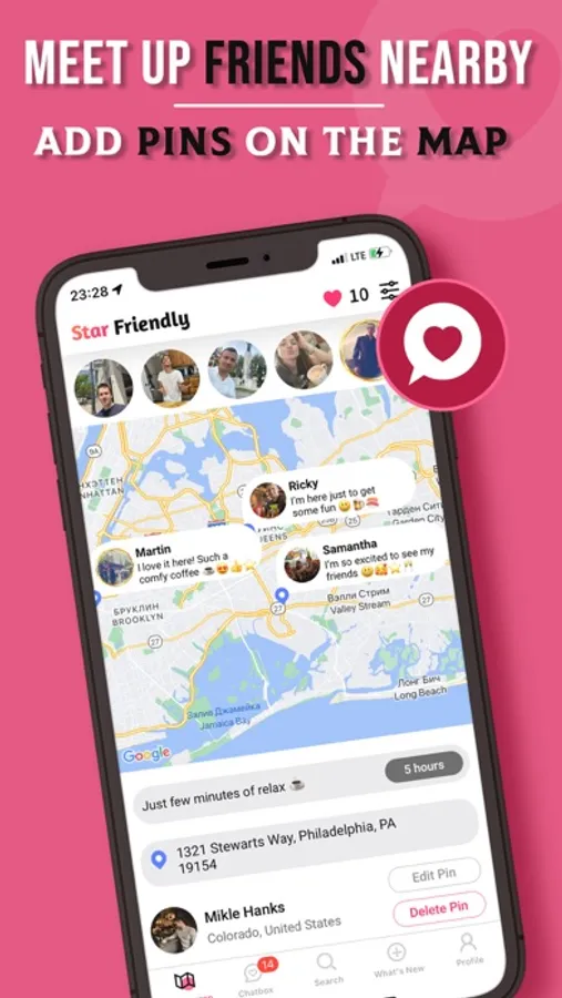 It's easy to find people by using Search according to desired parameters. StarFriendly allows you to freely choose people you want to chat with, and get likes from others, send and receive gifts! Drop pins on the map, earn likes, and cultivate thriving connections. Your pins aren't just marks – they're showcases of your unique persona or business prowess. Explore all the remarkable features of StarFriendly now and immerse yourself in a world of captivating connections!