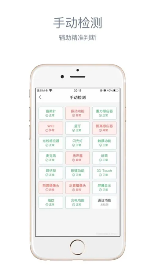 可检测指南针,振动,重力感应,WiFi,蓝牙,距离感应,光线感应,闪光灯,触摸功能,麦克风,扬声器,听筒,网络锁,按键功能,3D Touc功能,摄像头,屏幕显示,指纹面容,充电功能,通话功能等。