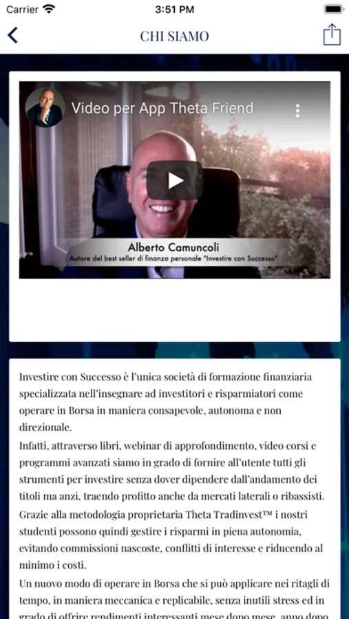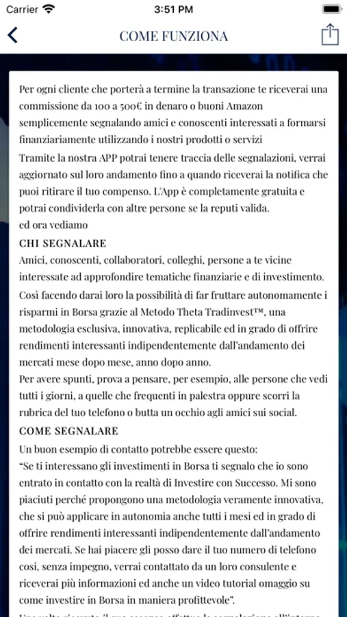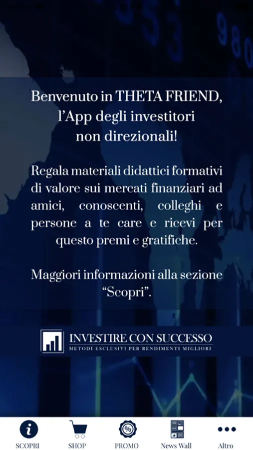 Benvenuto in ThetaFriend, l’App di Investire con Successo che permette ai tuoi amici di ricevere gratuitamente materiali didattici di valore su come operare in Borsa con profitto e a te di vederti riconosciuti premi e gratifiche. Scarica l’App e, tramite l’apposita funzione, presentaci amici, conoscenti, collaboratori, colleghi, persone a te vicine interessate ad approfondire tematiche finanziarie e di investimento. Così facendo consentirai ai tuoi contatti di ricevere in regalo video e materiali esclusivi e darai loro la possibilità di far fruttare autonomamente i risparmi in Borsa grazie ad una metodologia esclusiva di tipo non direzionale, innovativa e replicabile. Un modo di investire già utilizzato con soddisfazione da quelle persone che, non accontentandosi di risultati mediocri, hanno l’obiettivo di ottenere rendimenti dai mercati finanziari il più possibile costanti mese dopo mese ed anno dopo anno. Se poi questi investitori sceglieranno di formarsi finanziariamente con noi, con piacere premieremo il tuo aiuto ed il tuo supporto. Infatti, ThetaFriend è programmata per segnalarti eventuali acquisti di nostri prodotti/servizi formativi da parte delle persone da te presentate, così da ricevere gratifiche che, a tuo piacimento, possono essere in denaro oppure tramite crediti spendibili in corsi o per i tuoi acquisti su Amazon. Una formula quest’ultima che è molto piacere “morbida” rispetto a quello che potrebbe dare da intendere ("tracciare le persone”) la prima. L’App ThetaFriend è completamente gratuita; scaricala ora e tieni presente che, se riterrai utile il suo utilizzo, potrai anche condividerla con altre persone. A garanzia della qualità ed efficacia dei nostri prodotti, dei nostri servizi e delle metodologie esclusive che insegniamo vi è il suo ideatore, Alberto Camuncoli, investitore con più di 25 anni di esperienza sui mercati finanziari. I suoi autorevoli interventi sono ospitati in trasmissioni televisive, articoli, conferenze e seminari ed il suo best seller Investire con successo ha migliorato il modo di investire di migliaia di lettori, ricevuto centinaia di recensioni 5 stelle ed è diventato in breve tempo testo di riferimento in ambito di finanza personale. Contribuisci quindi, con un semplice gesto, ad elevare l’istruzione finanziaria delle persone a te vicine, aiutandole così ad investire consapevolmente ed autonomamente. Riceverai in cambio la loro gratitudine e la nostra ricompensa. Sito aziendale: www.investireconsuccesso.com