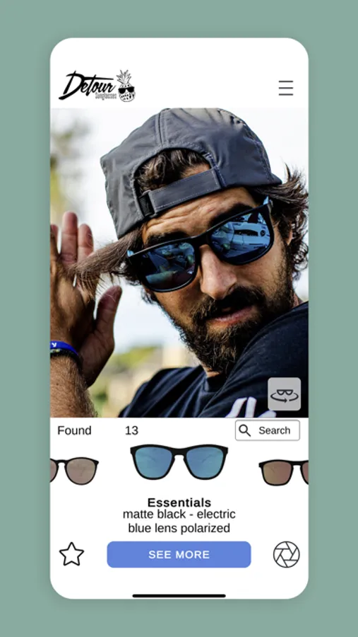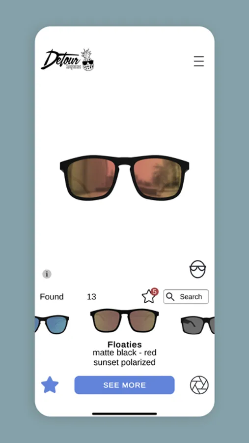 The app allows you to try on stylish sunglasses models from DetourSunglasses using the mobile app. It is very easy. Just open the app and choose a model for you. Place your face in front of the camera and your model will appear on the screen in augmented reality technology.