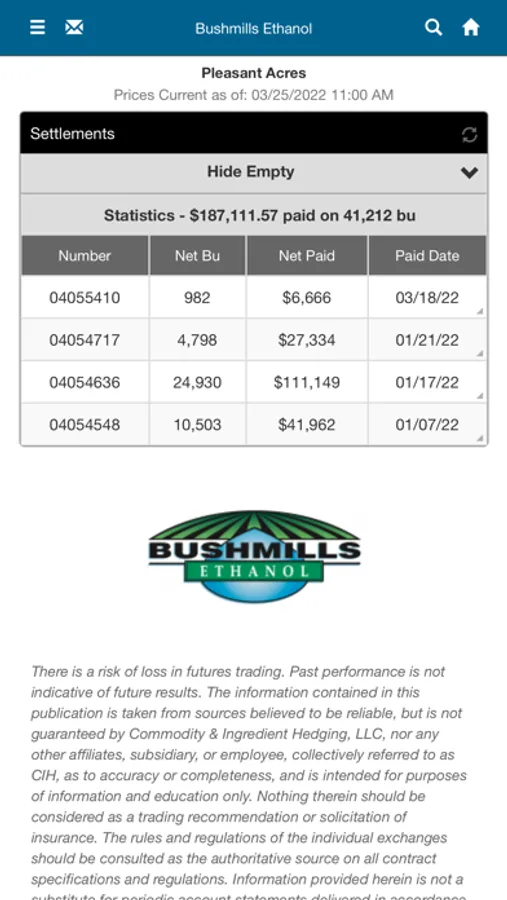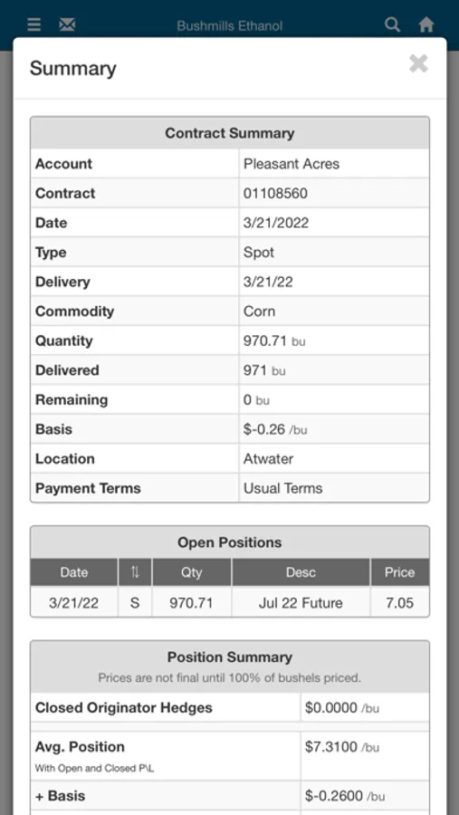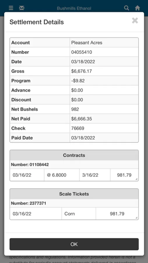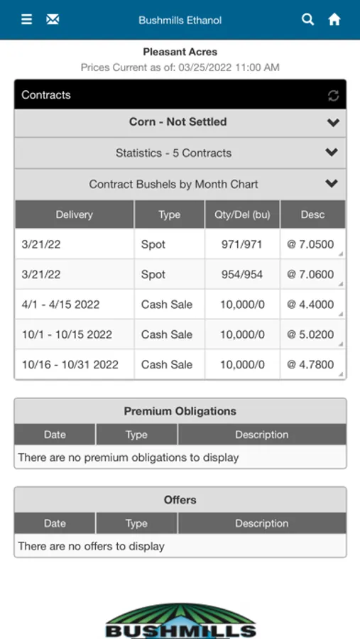Track your scale tickets, contracts, and settlements plus monitor markets and cash bids right from your mobile device. Make corn sales offers 24/7. Available for growers to download and use at Bushmills Ethanol.