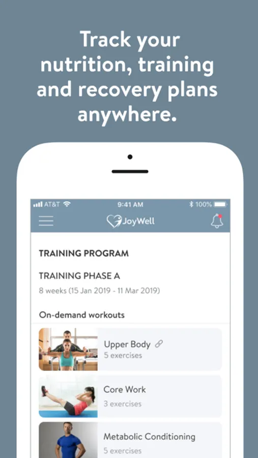 With the JoyWell App, JoyWell members can access custom videos, tips, education, and professional advice on functional health and musculoskeletal wellness topics from your wellness team. Additional features include: