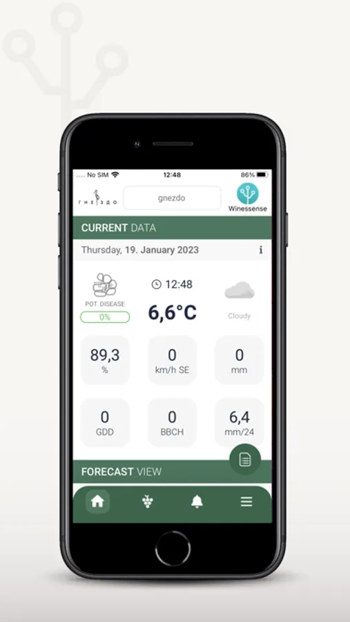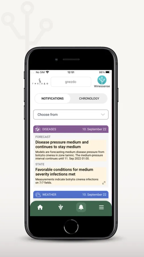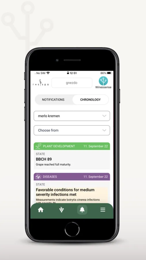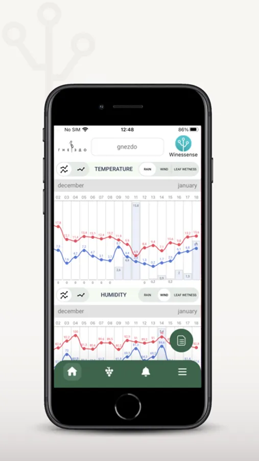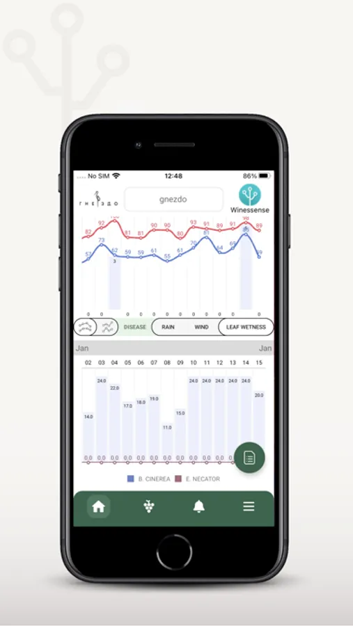 Winessense is a mobile application which aggregates data from Winessense sensors installed across the vineyard and translate it in your language. The sensor system is a combination of sensor units measuring temperature and humidity and central units measuring temperature, humidity, rain and wind. The data is processed in the cloud and data can be accessed with the app. You can enable in app notifications to never miss any of key events in vineyard.