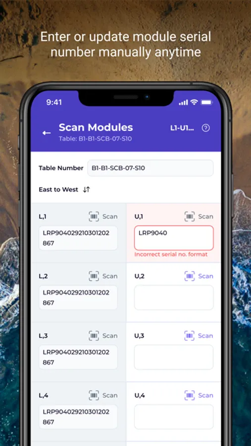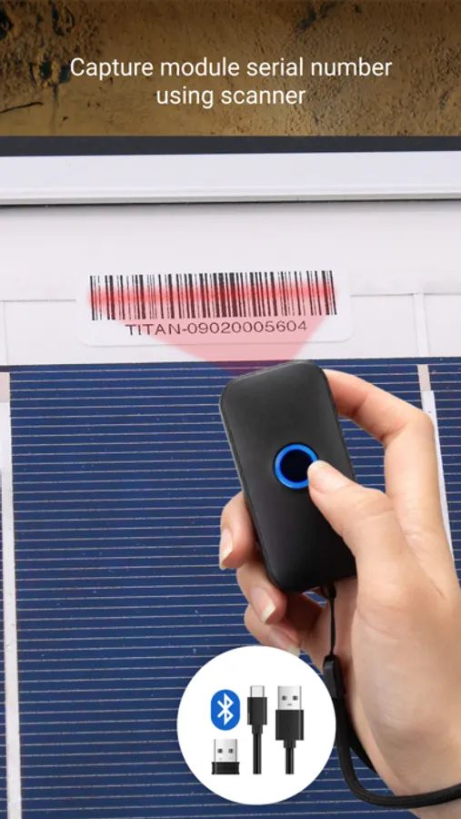 Zeitview Serial ID allows Asset owners to capture serial IDs of the entire asset in their site by scanning the barcode stickers associated with each PV module, scanning can be achieved through a phone camera or hardware Bluetooth scanners. The captured serial IDs will provide identity to each module in a digital format tagged with geolocation, module coordinates, and inverter/string level information.