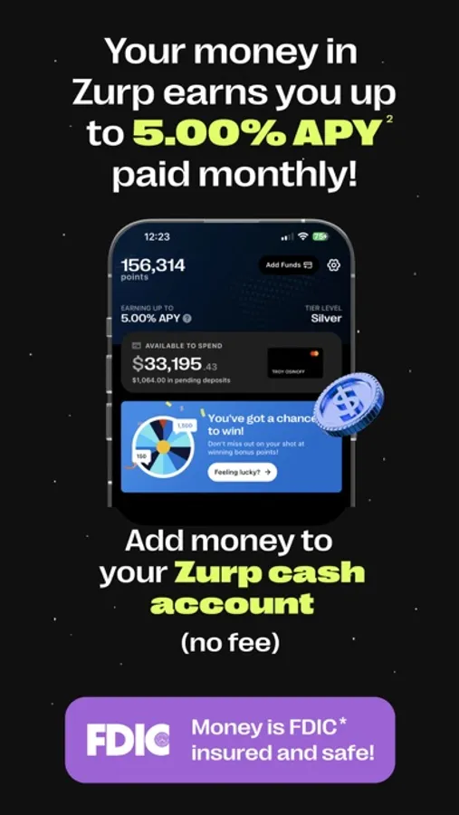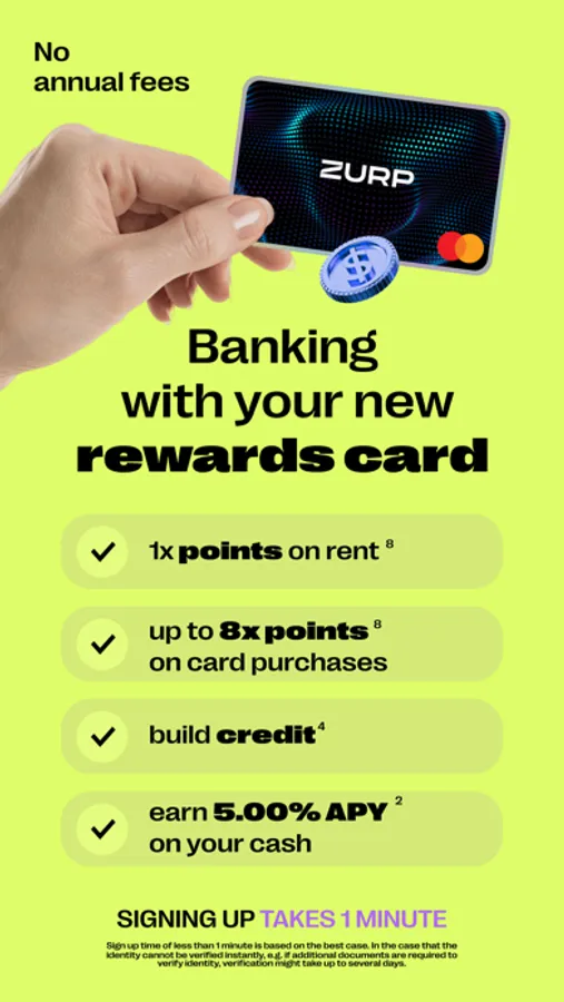 Signing up for Zurp¹ means you get a Zurp World Mastercard® and a Zurp Cash account. Think of your Cash account as a supercharged bank account that earns 5.00% Annual Percentage Yield (APY)² on your money. It comes with no monthly fees and it sets the limit to your Zurp Card, too.