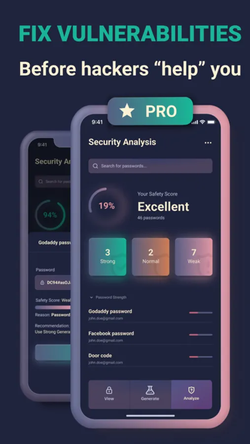 • Analyze and fix vulnerabilities, detect and update weak passwords, and generate new and strong instead of old and repeating keys using a password analyzer.