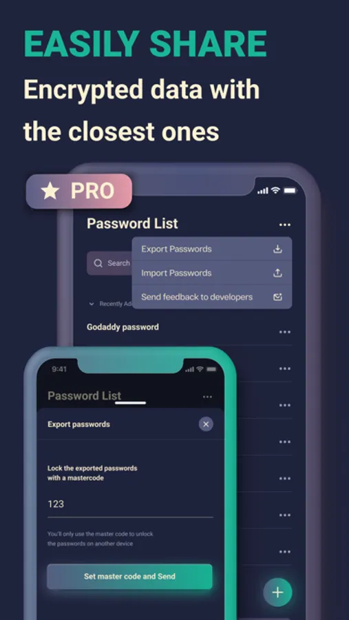 • Export & Import data into an encrypted file protected by a password.