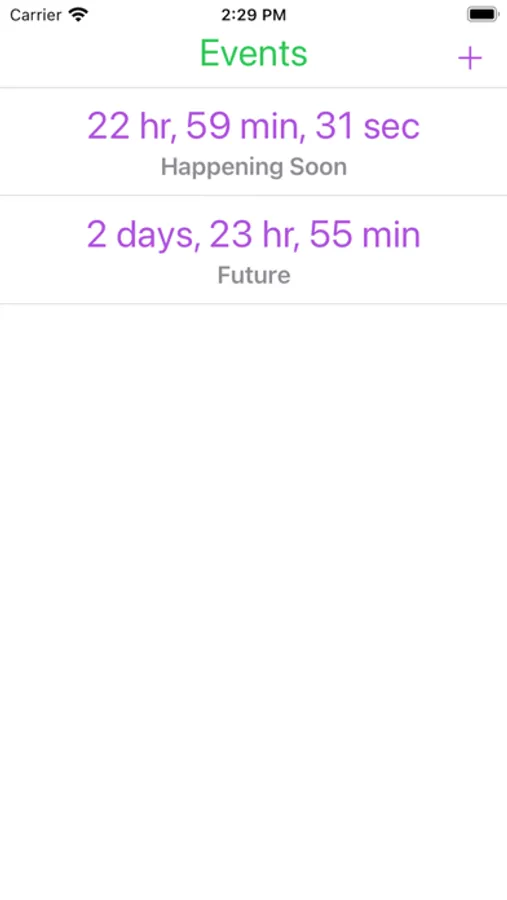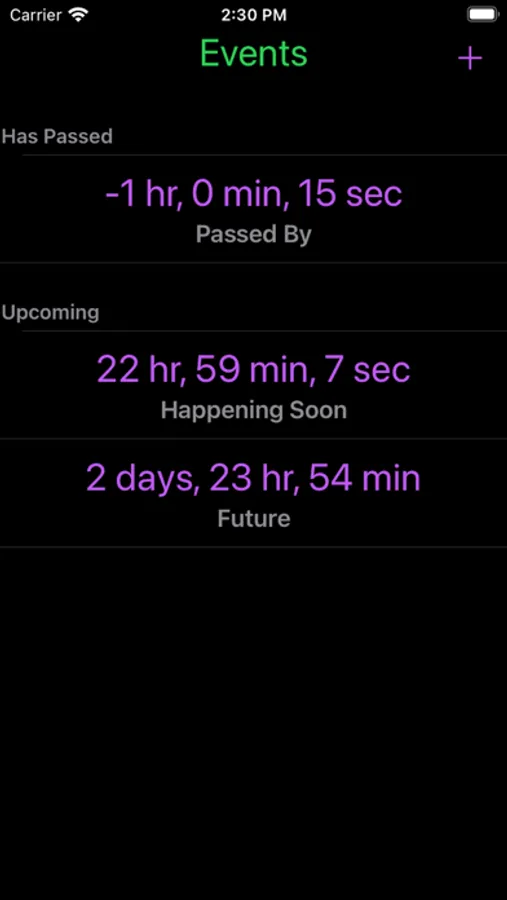 - If there are dates in Past and Future, view splits into two sections. Time starts as Days/Hours/Minutes until it drops below 24 Hours, then goes to Hours/Minutes/Seconds.