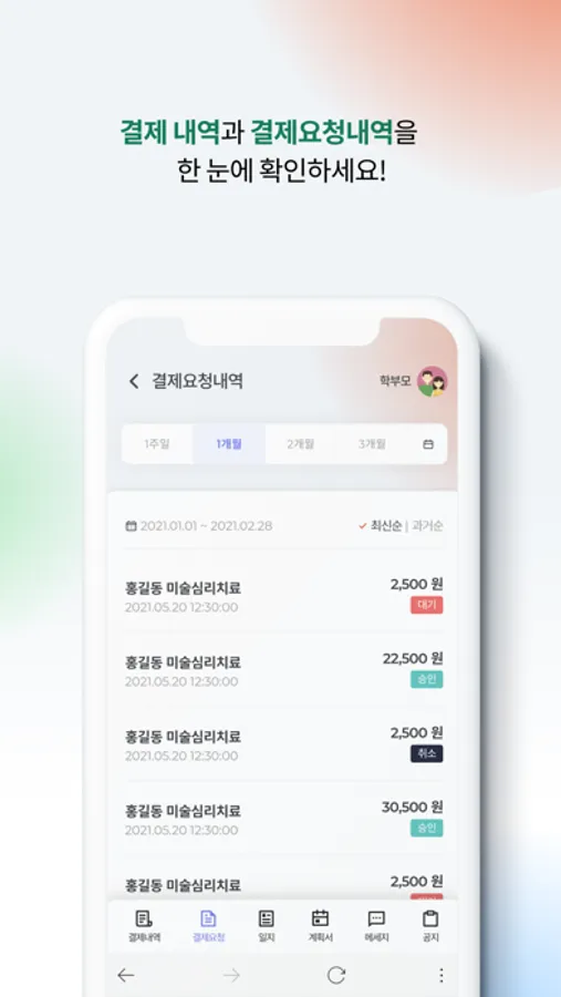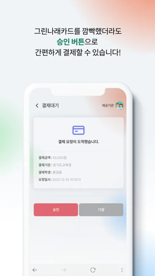 그린나래카드 미소지 시 제공기관에서 학부모님께 결제 요청을 보내면 수업내용 확인 후 결제를 할 수 있습니다.