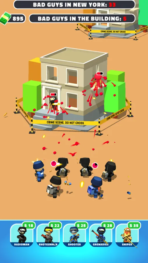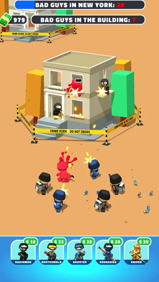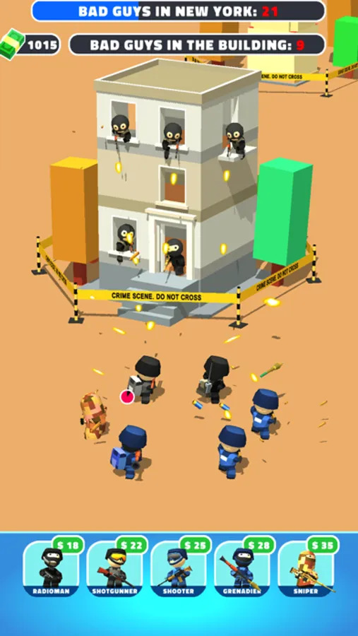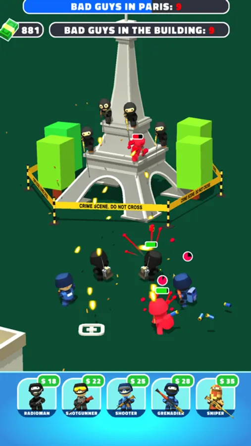 The bad guys have taken over the buildings in the most famous cities in the world. It's your job to take them out. Choose your team of shooters and then start the level. If some of your troops drop, you can replace them with the money you earn from doing jobs. Get all of the bad guys out of a city to move onto the next one.