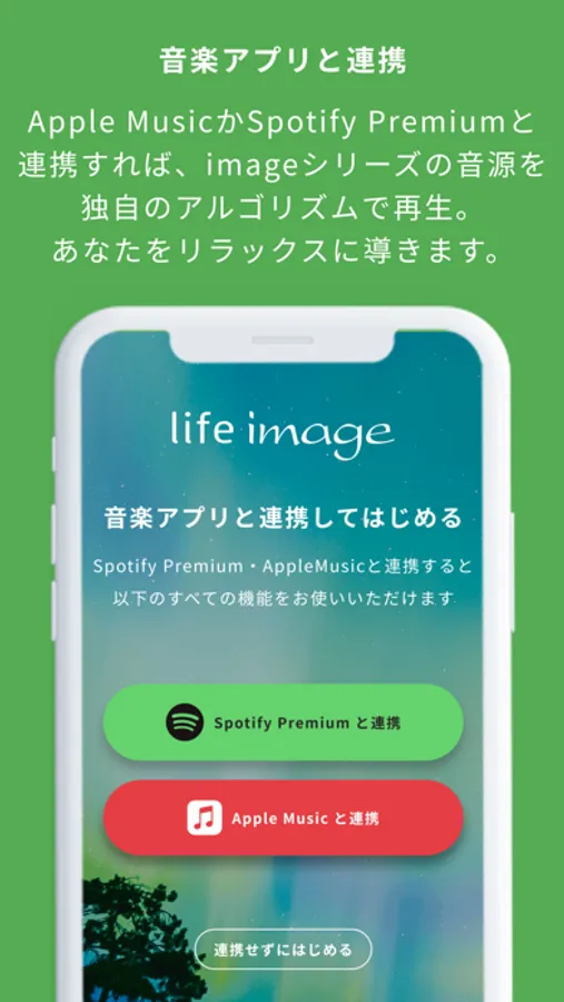 「life image」自体は無料で使用できますが、Apple MusicあるいはSpotify Premiumと連携して曲を再生しますので、どちらかのアカウントを取得してお楽しみください。