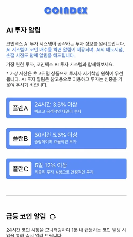 코인덱스 AI 는 24시간 실시간으로 코인 시세를 분석하여 매수할 타이밍과 매도할 타이밍, 손절까지도 알림으로 제공하여 코인 시세를 누구보다 쉽고 빠르게 확인할 수 있습니다.