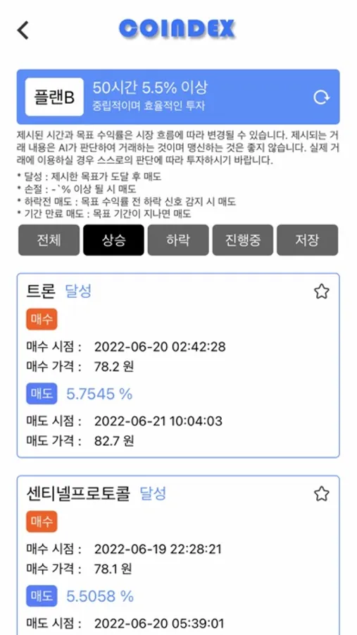- 코인덱스 자동 AI 프로그램매매가 실행하는 거래를 알림을 통해 받아 볼 수 있습니다.