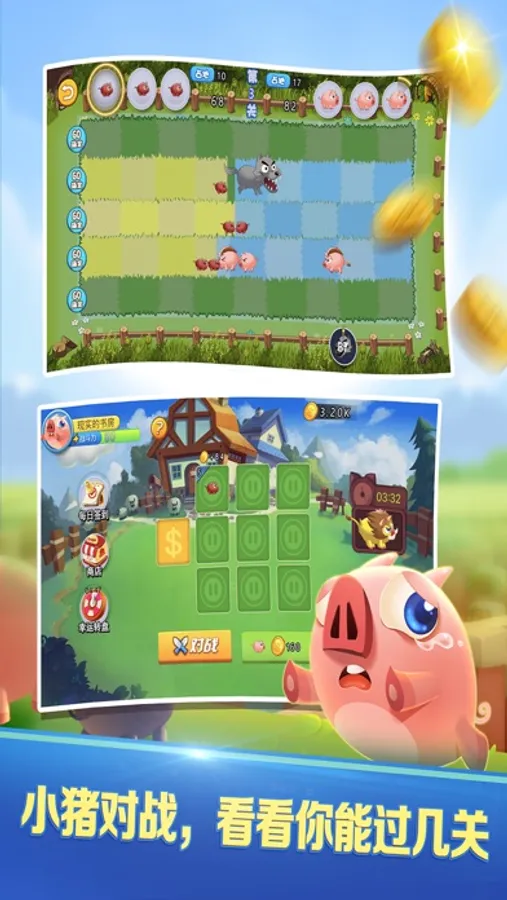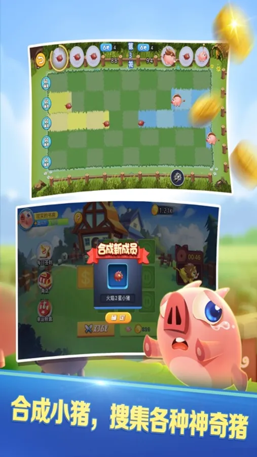 小猪变火猪再变钢铁猪,看看谁能合到最高境界。合成的小猪战力惊人,赶紧参加神奇的对对碰游戏,赢取更多金币,合成更高等级小猪!