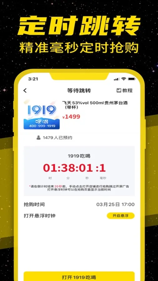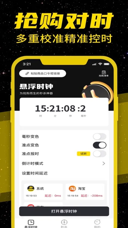 悬浮时钟app是一个免广告的抢购助手软件,为用户在各打电商平台抢购商品提供便利的【秒杀抢购辅助工具】,抢购悬浮窗可悬浮于手机屏幕任意界面不影响点击操作,可以选择显示【毫秒时钟】级的系统时间、北京时间、淘宝时间、京东时间等,一键跳转功能可【直达电商平台秒杀页面】,助您抢购秒杀快人一步,提高抢购成功率;