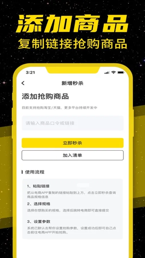 可添加管理抢购链接,APP会准时提醒用户进行抢购秒杀;