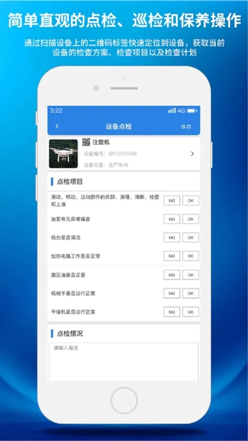 设备E维保App是一款设备无纸化管理软件,适用于工厂制造型企业、服务维保业、小区物业、连锁实体、学校机构、海港、水务、环保等任何行业的设备日常点检、巡检、保养和报修维修、备品备件等无纸化管理。