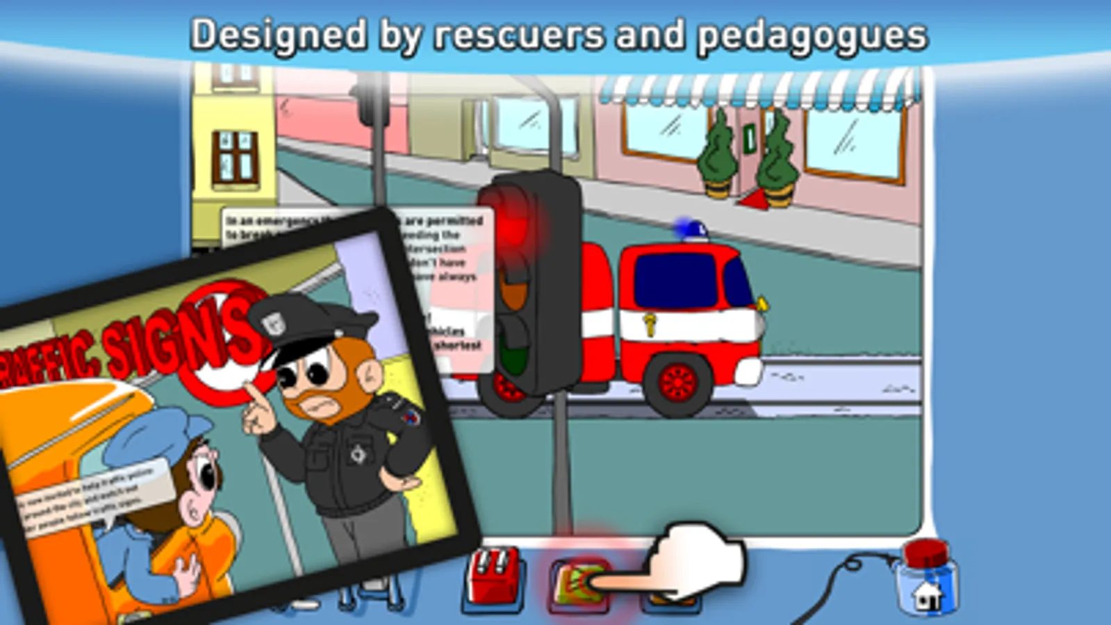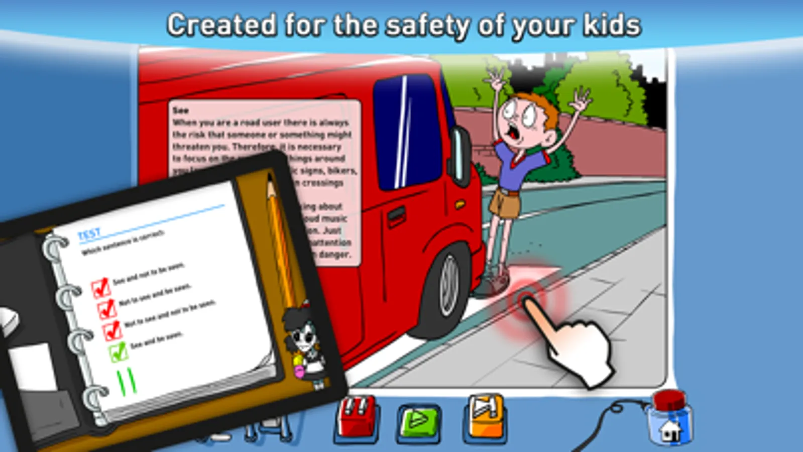 Presented in an entertaining and informative way, this animated interactive traffic education app for your tablet and phone offers a wealth of information on different traffic dangers. It is an application full of games and tests. The figures of Zebra Crossing and Traffic Line, whose voices are dubbed by native speakers, will keep you company throughout as many as 12 modules telling you everything about crossing the road, behaving in a car, seeing and being seen in heavy traffic, riding a bike, traveling by train, dangers lurking on the railroad and much more.