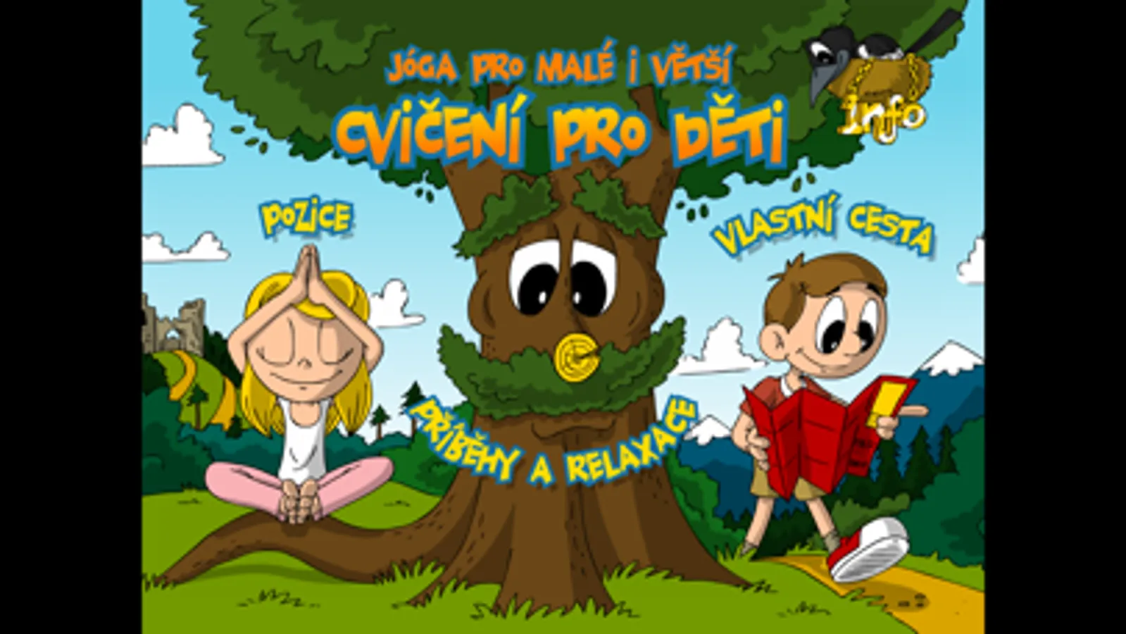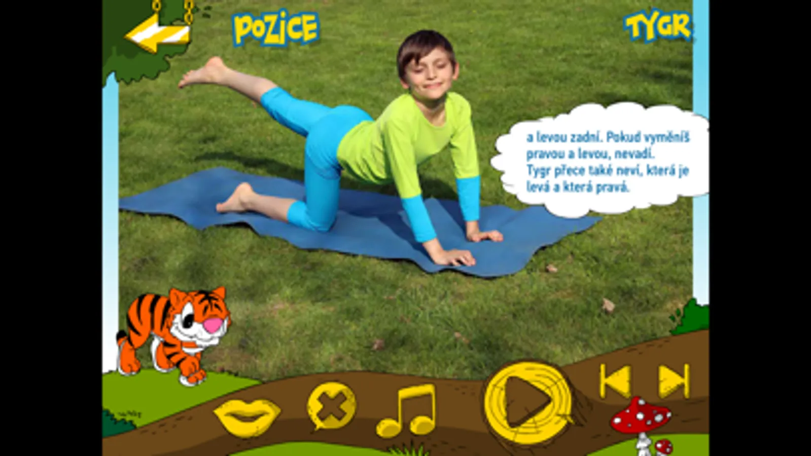 Obsahuje 30 pozic (např.: kočka, pes, velbloud, žába, ryba, bojovník, pozdrav Slunce), které vycházejí z jogových cviků upravených pro menší děti. Jednotlivé fáze a variace pozice jsou vysvětleny a vyobrazeny ve fotkách (nacvičené dětmi). Každá pozice má svou drobnou veselou animaci, aby děti pobavila, a krátkou básničku namluvenou dětmi.