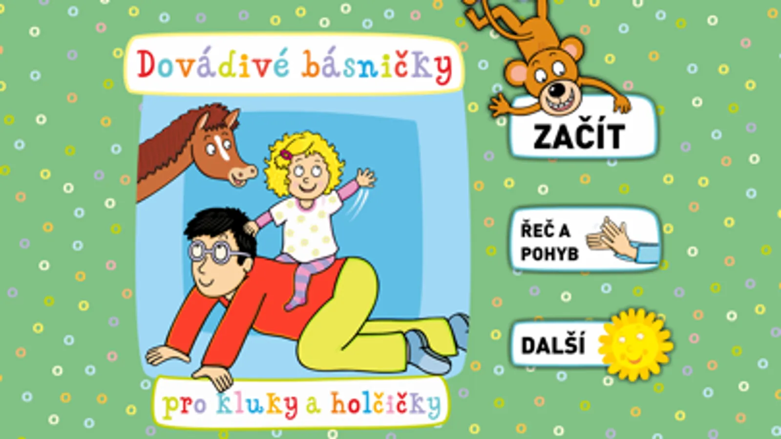 Určitě také rádi vzpomínáte na časy bezstarostných her, které provázely vaše dětství. V aplikaci naleznete inspirativní náměty na dovádění s vašimi dětmi. Obsahuje soubor básniček s jednoduchou hříčkou. Všechny jsou určeny pro dovádění ve dvojicích nebo v dětském kolektivu. Řadu hříček budete určitě znát. Mnohé z nich jsou generacemi prověřené, jako třeba hra na rybáře a rybky nebo na schovávanou a bavili se s nimi už naši dědové a babičky. Nové je však jejich spojení s básničkou, která dodává hříčce nový náboj a dělá ji pro děti zajímavější. Básničky jsou jednoduché, snadno zapamatovatelné a děti se při nich zdokonalují v řeči. Hlavním cílem těchto hříček je vytvoření vzájemného vztahu a pocitu blízkosti – ať už s námi dospělými nebo s ostatními dětmi. Básničky mohou pomoci Vám i dětem, aby jste se při dovádění vzájemně potkávali a společně se smáli. Nenásilnou formou včleňují dítě do dětského kolektivu. Děti se při nich učí poznávat jeden druhého, učí se vzájemnému vztahu já-ty, já-my. Přejeme hodně legrace při dovádění s dětmi.