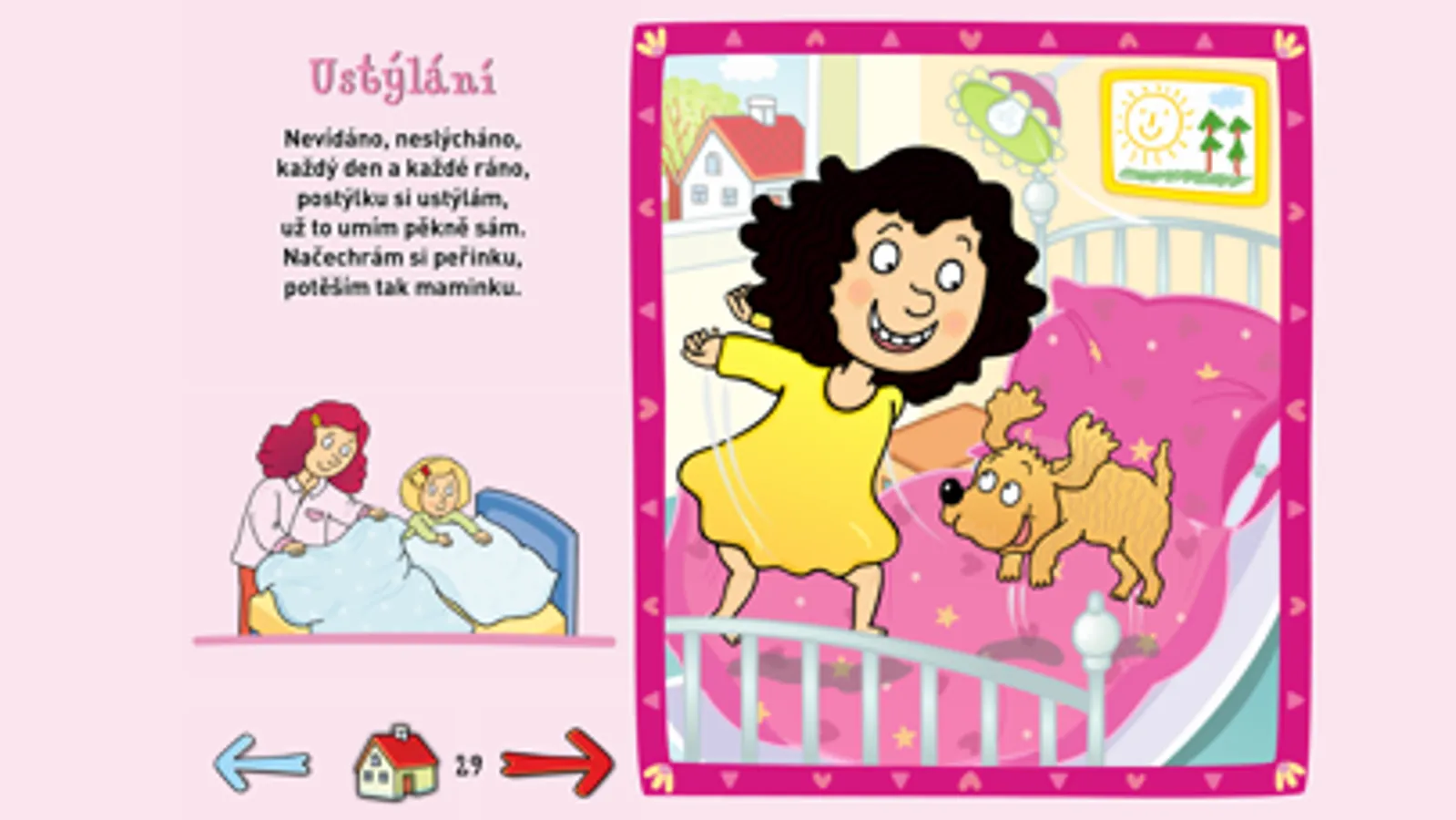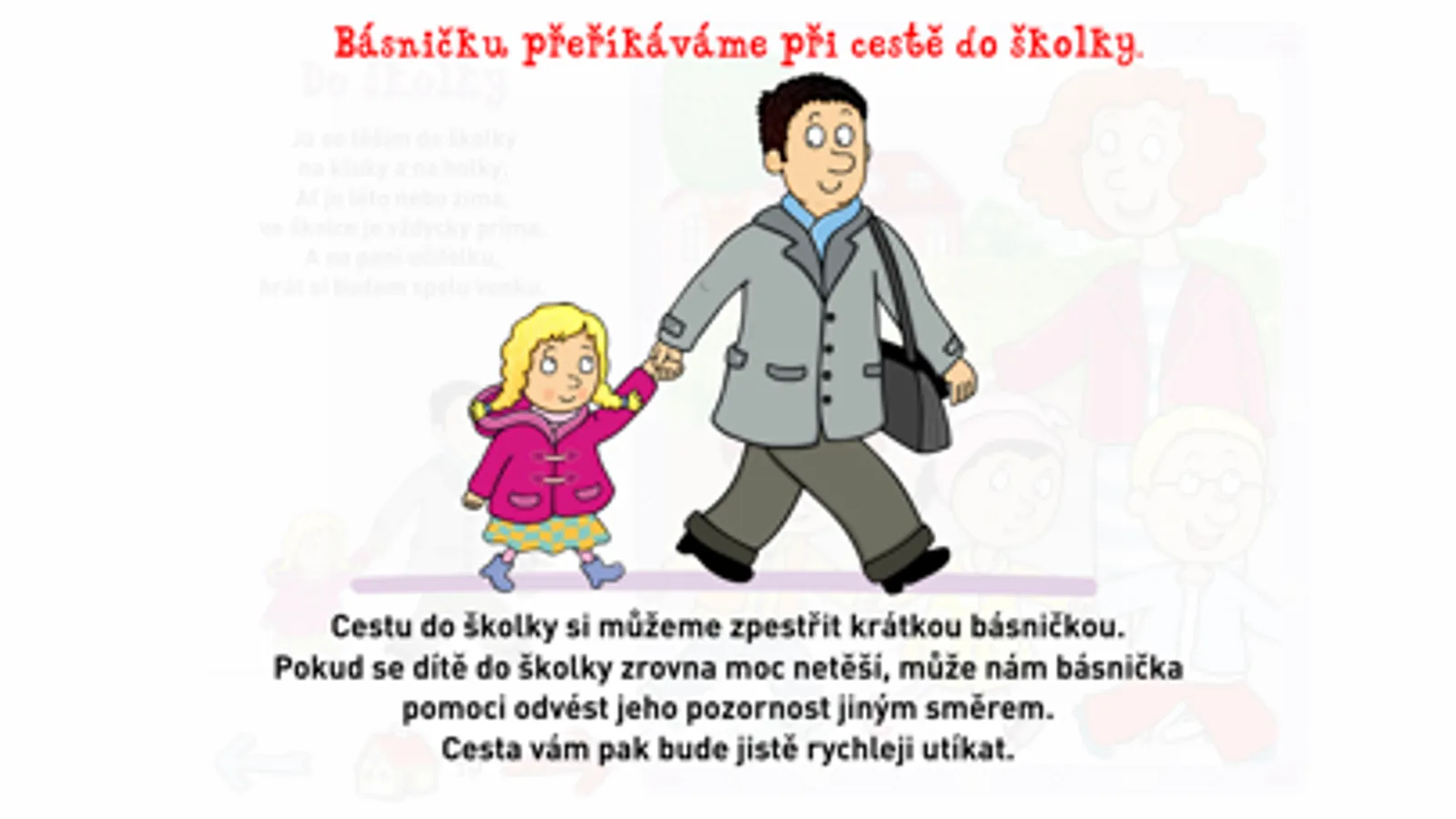 V této aplikaci najdete soubor jednoduchých, snadno zapamatovatelných básniček, které můžete dětem přeříkávat při každodenních činnostech, jako je mytí zoubků, česání vlásků, stříhání nehtíků, papání. Básničky vám mohou pomoci vytvořit běžné denní rituály a proměnit jednotlivé činnosti v zajímavou hru. Většina návyků, které si má dítě v předškolním věku osvojit, nemusí být s „šikovnými“ básničkami nuda, ale prima zábava. Verše děti nenásilně vtahují do jednotlivých činností a připravují je na to, že vše jednou zvládnou samy. Přejeme spoustu legrace s básničkami.