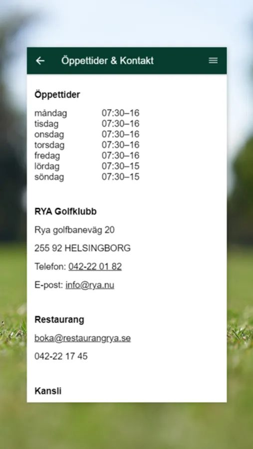 Med appen för Rya Golfklubb kan du som medlem få tillgång till viktig information via pushnotiser. Du kan följa vad som händer på klubben via nyhetsflöden, boka golflektion, läsa mer om våra banor, ta del av information om vår restaurang, öppettider och mycket mer.