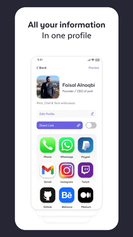 Instantly share your social media, contact info, files, and more with just a tap of your pod