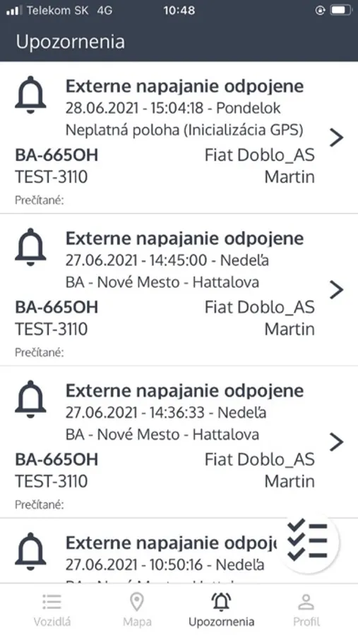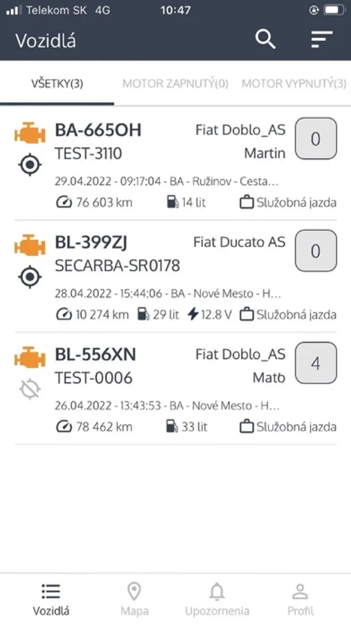- tabuľkový prehľad všetkých vozidiel na ktoré má používateľ oprávnenie