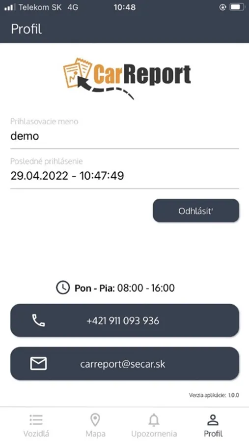 Poskytuje najdôležitejšie informácie o vašich vozidlách, ako doplnok k webovej aplikácii CarReport (portál www.carreport.sk, www.carreport.secar.sk)
