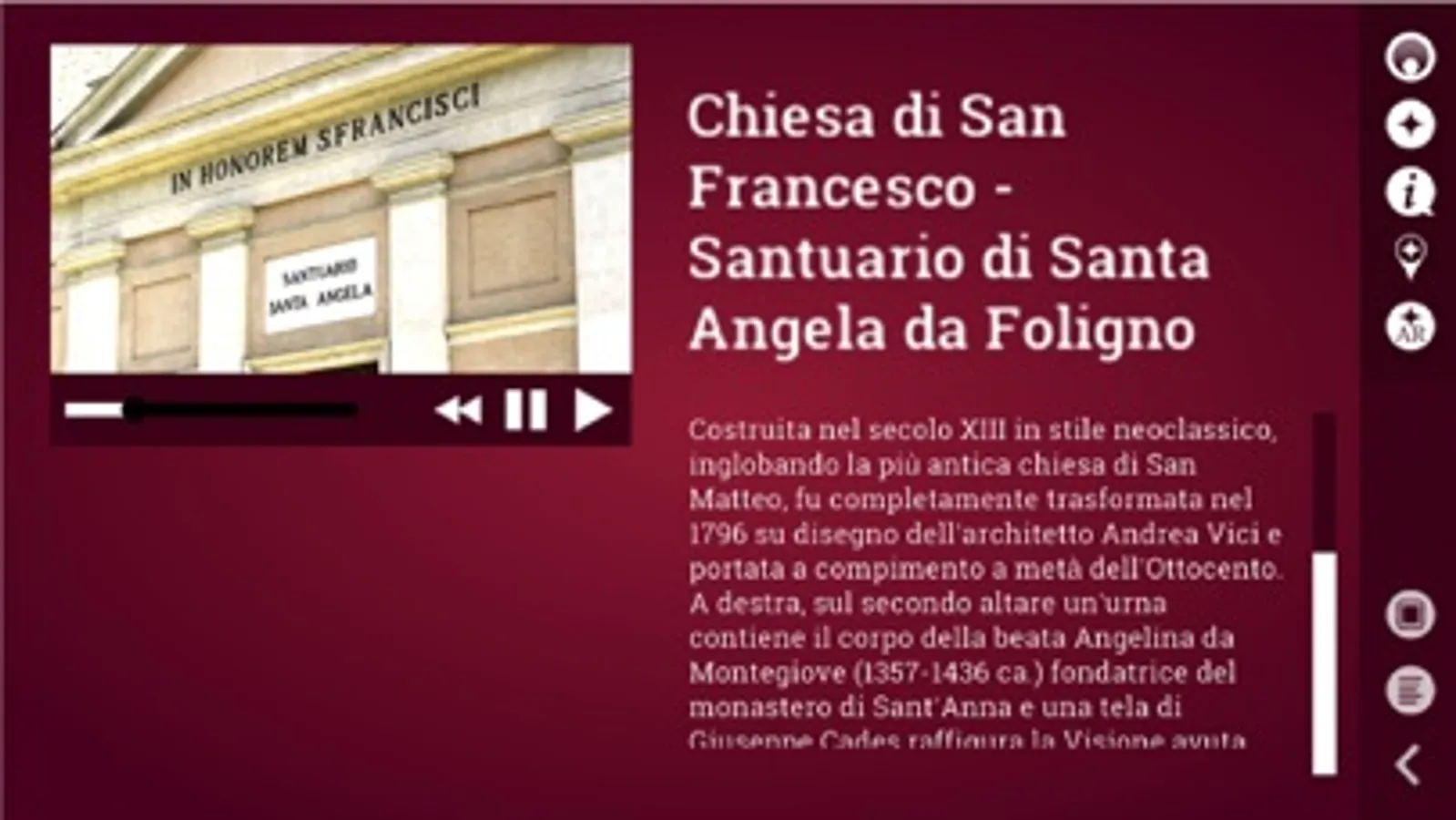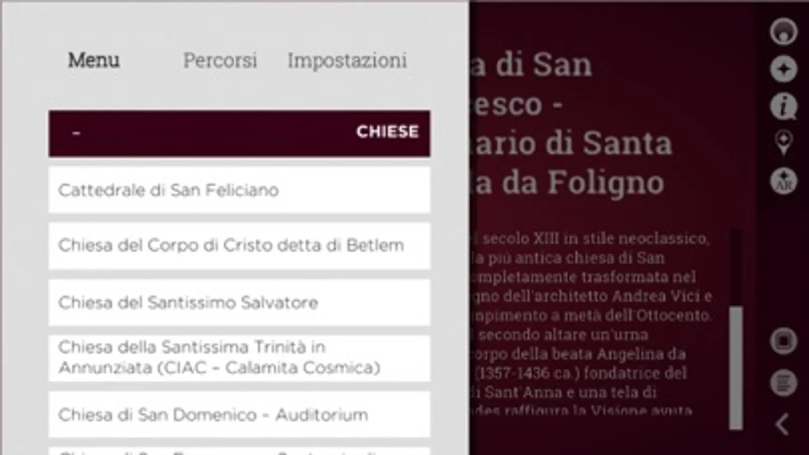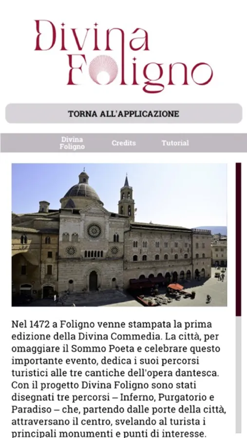 Divina Foligno è una applicazione che sfrutta le funzioni del GPS, dell’Augmented Reality e del Bluetooth per dare al turista una esperienza unica e coinvolgente di visita del patrimonio culturale della città di Foligno e delle emergenze naturalistiche del territorio circostante.