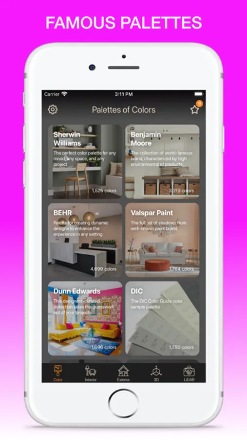 Very often many people feel the need to visually imagine the interior of a room or the appearance of a building. There are many applications that can do this in workarounds without providing an opportunity to see the real image online. We created this app for just such an occasion! Thousands of colors and shades of the most widespread color palettes in the world contained in the application will help designers, engineers and ordinary people in any corner of the globe to take advantage of the opportunity to see the visual perception of your interior or exterior of the house. With the help of modern technologies provided by Apple gadgets, we have implemented the possibility of painting surfaces using the camera of devices with the appropriate equipment(LiDAR scanner) and the most realistic color rendering. The interface of the application is very friendly, we hope you will like it's simplicity and reliability. We are sure that this application is the best e-catalog of colors in the world, created to fulfill your desires!