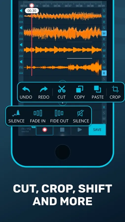 Change the duration, crop and cut the selected areas with only a few taps. Save your files or entire projects on your device. Even if you don’t save, the app will back up any unsaved progress (can be activated/deactivated in the settings).