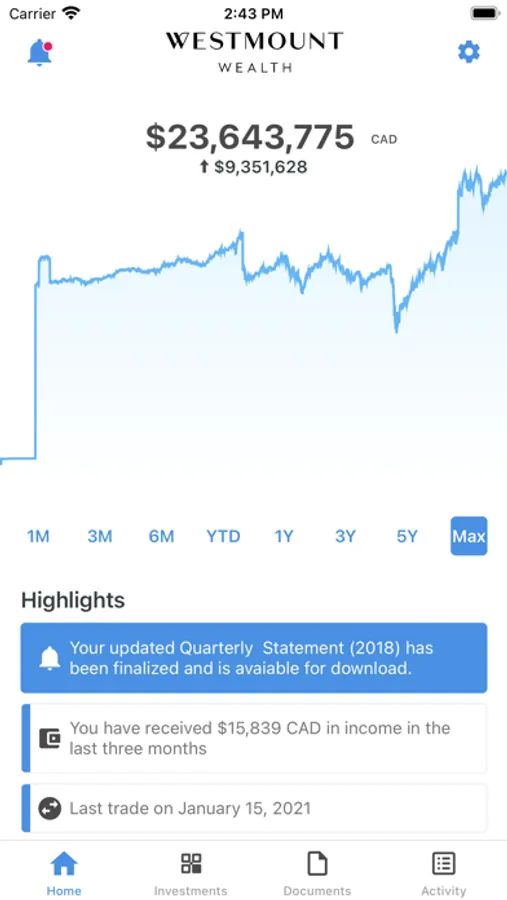 Welcome to the investment portal app for Westmount Wealth clients. You will be able to use it to view the current value of portfolio, access your monthly custodian statements from Fidelity Clearing Canadian and open your quarterly Portfolio Manager statements from Westmount Wealth.