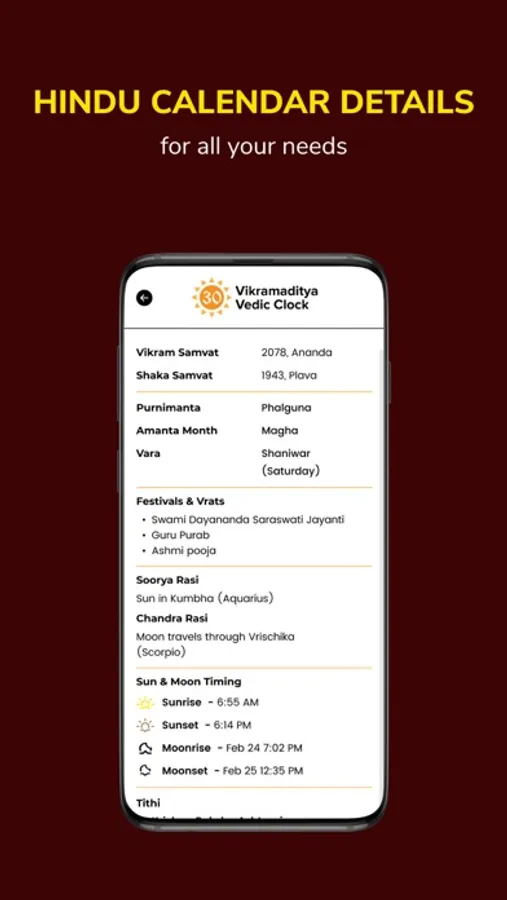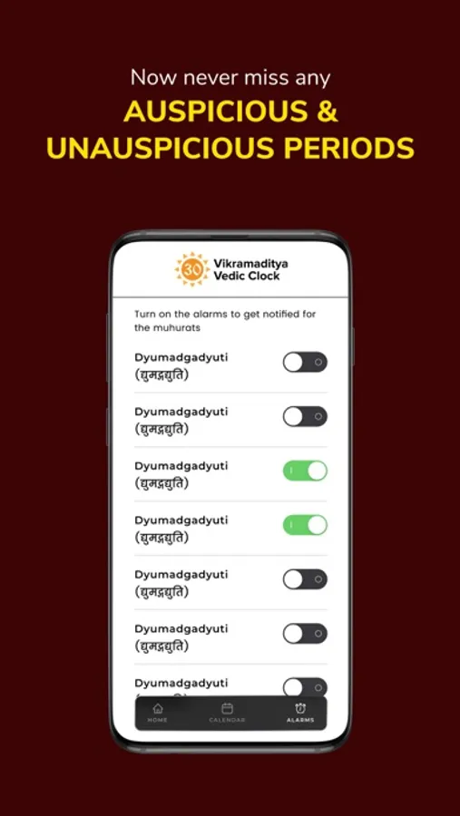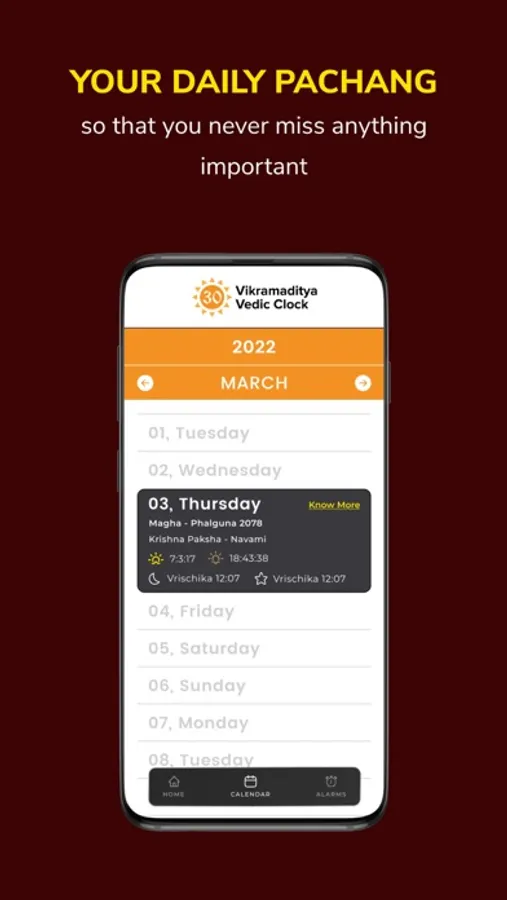 Person can also fix Alarms according to desired Muhurut , also can see Hindu Calender & find its details.