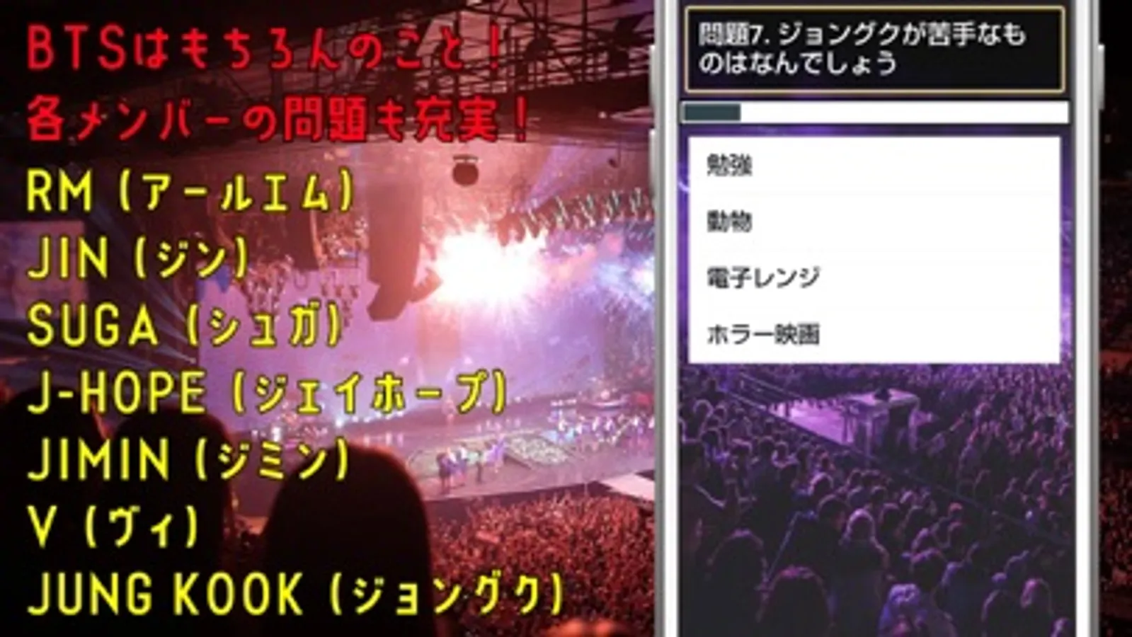 大人気k-popアイドルグループBTS(防弾少年団)の検定アプリ登場!!メンバーそれぞれに関する問題も多数有。