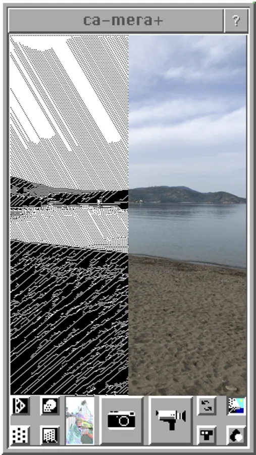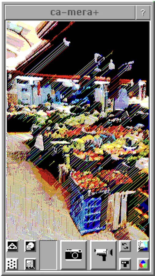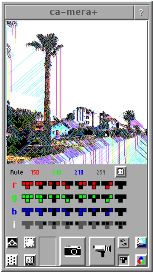The successor of probably the nerdiest camera app ever made, ca-mera+ uses a cellular automaton to interpret the colors of your camera stream. The resulting images are pixelated and contain unique patterns created by cellular automata. The output can be black and white, or one of several retro color palettes (CGA 4 and 16 colors, 1-bit RGB, etc.).