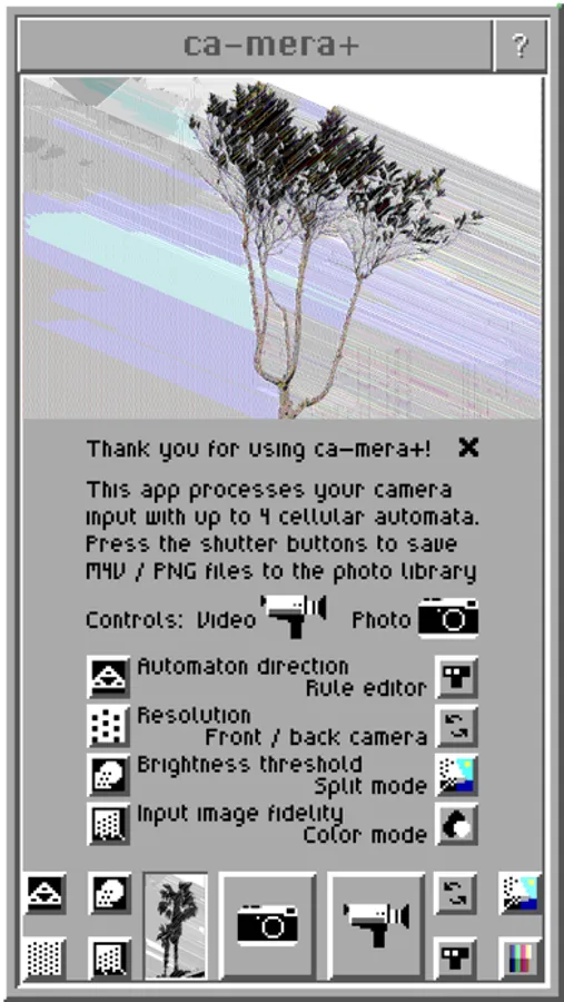 This app provides "selfie" and "split" modes, records video, and lets you change the appearance of the pictures by controlling the automaton application direction, its rules, the resolution, the input brightness, and the input fidelity (i.e. to which extent the cellular automaton is allowed to run freely).