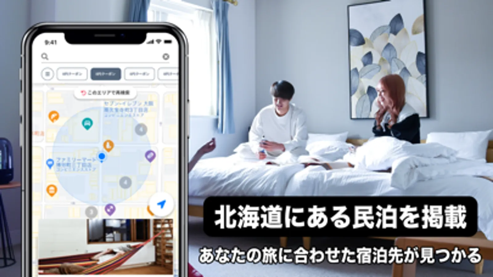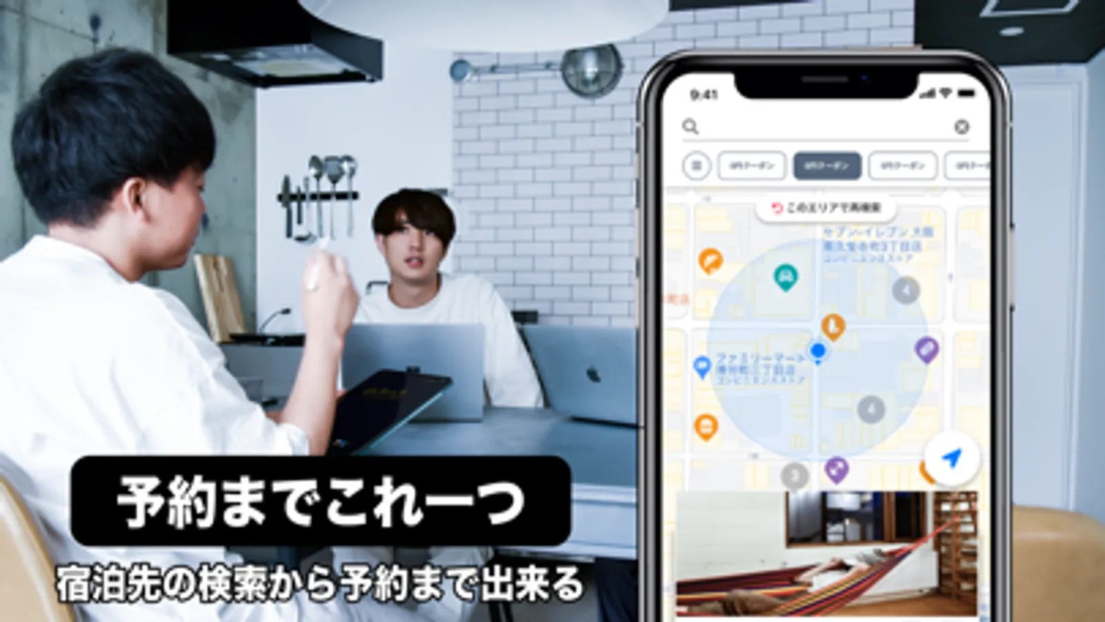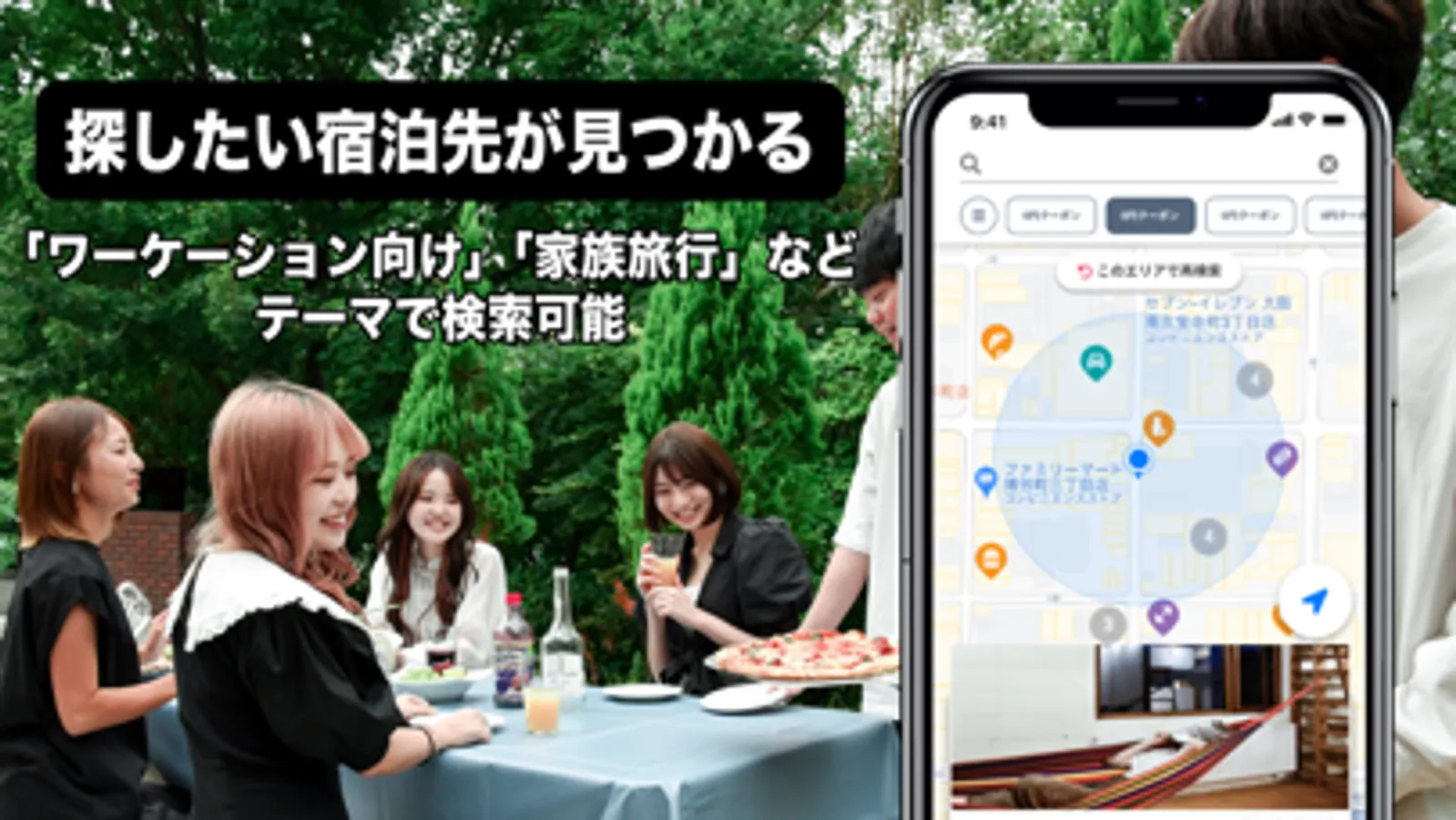 このアプリではアンドザヴィラの施設を検索でき、同時に周辺の店舗や施設も検索できます。