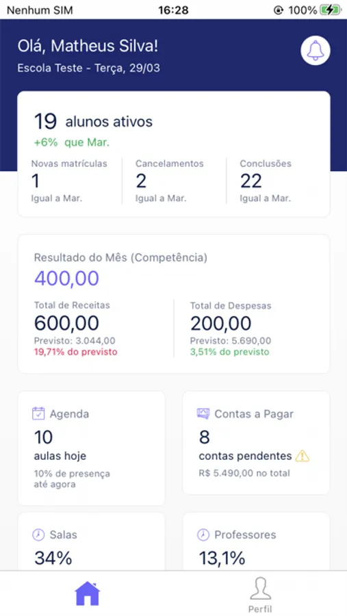 - Financeiro: Veja um resumo das transações realizadas na escola, entradas, saídas e saldos.