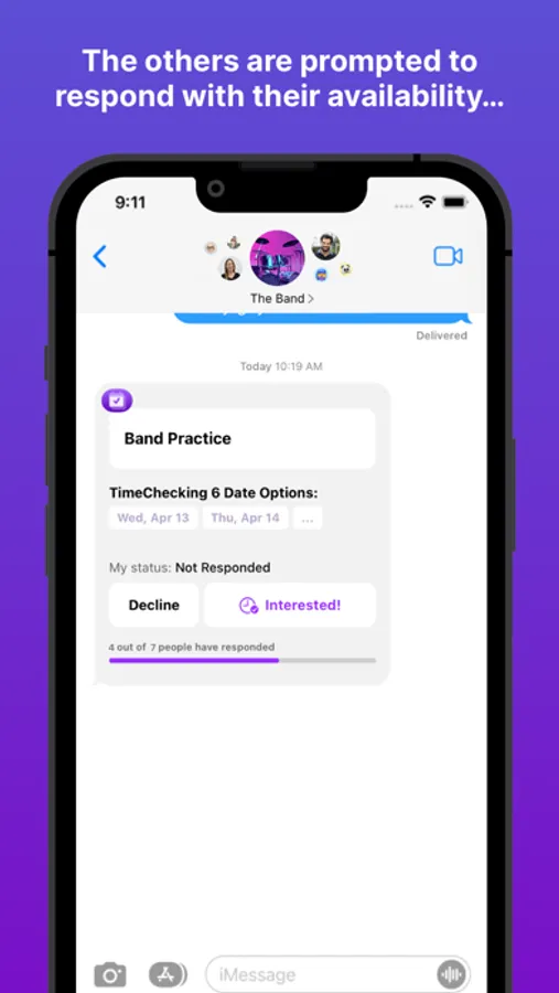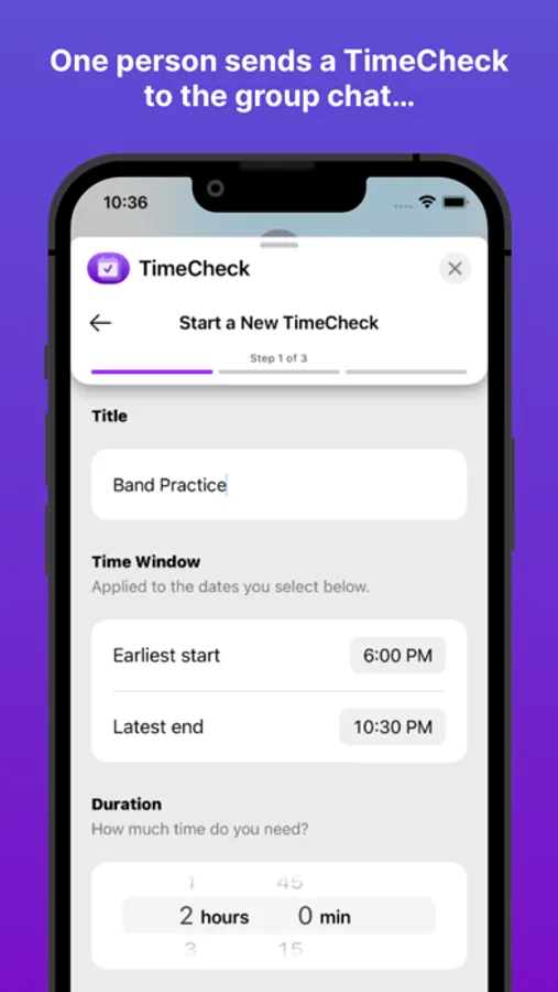 To send a TimeCheck go to an existing text thread, or start a new message, then tap on the TimeCheck icon from the extensions bar, enter the details (time needed, earliest start/latest end, and the dates to check) and send it in the chat. No need to add recipients - it just goes to whoever is already in that iMessage thread. The app bubble shows in the chat inviting everyone to respond with their availability.