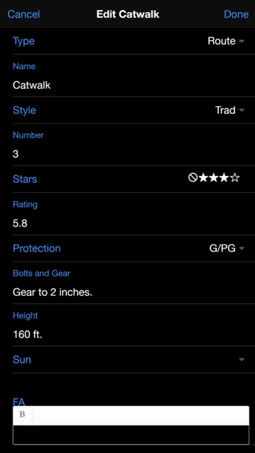 Authoring a rock climbing guidebook has never been this easy. Record details, take photos, draw lines, and collect GPS coordinates while at the crag. Compile the information in a What-You-See-Is-What-You-Get format, and easily update it as projects get sent or holds break. Both light and dark modes are supported automatically, based on your device's setting.