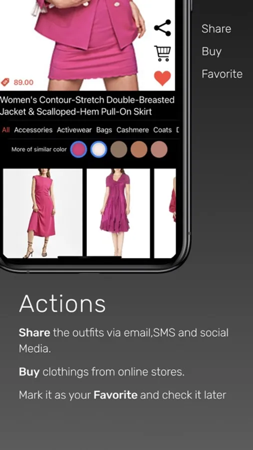- Similar fashions for your favorite style on your fingertip. When you browse fashion item, you can always browse the fashion of the same color or of the same style across stores and brands. Your endless wishlist at your fingertip.