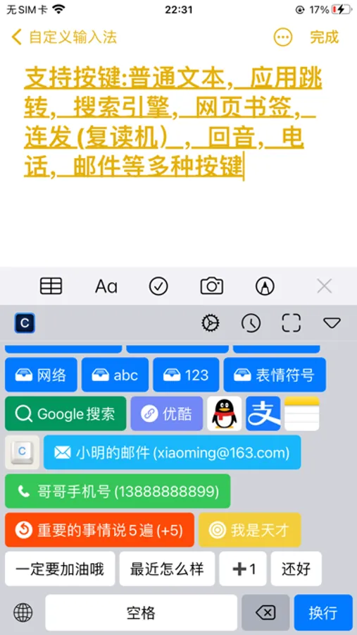 【Diversified Keys】Supports various buttons such as ordinary text, application jump, search engine, webpage bookmarks, continuous sending (repeater machine), echo, telephone, email, etc.